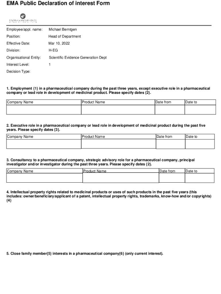 EMA Public Declaration of interest FormEmployee/apply. Name:Michael BerntgenPosition:Head of DepartmentEffective Date:Mar 10, 2022Division:HEGOrganisational Entity:Scientific Evidence Generation Disinterest