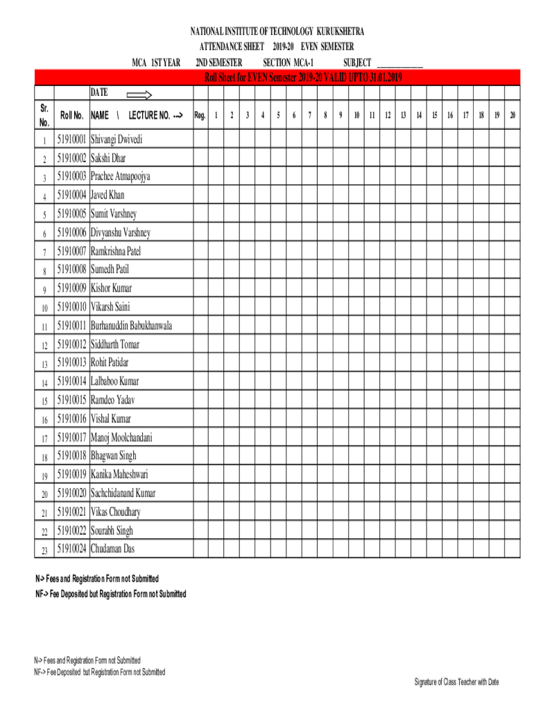 SUBJECT ___Roll Sheet for EVEN Semester 201920 VALID UNTO 31.01.2019