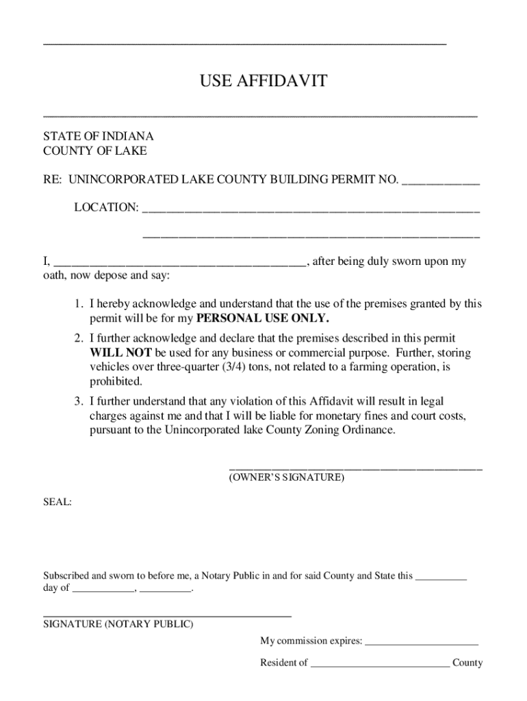 USE AFFIDAVIT STATE OF INDIANA COUNTY OF LAKE RE: UNINCORPORATED LAKE COUNTY BUILDING PERMIT NO. ___ LOCATION: ___ ___ I, ___, after being duly sworn upon my oath, now depose and say: 1. I hereby