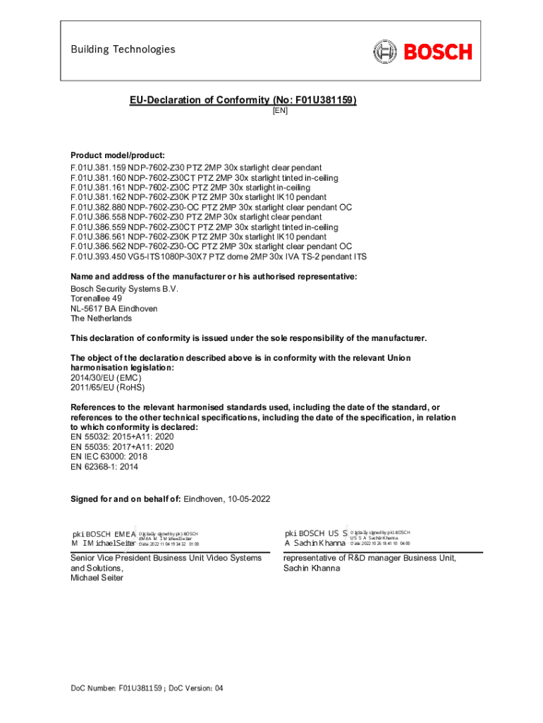 Building TechnologiesEUDeclaration of Conformity (No: F01U381159) [EN]Product model/product: F.01U.381.159 NDP7602Z30 PTZ 2MP 30x starlight clear pendant F.01U.381.160 NDP7602Z30CT PTZ 2MP 30x starlight