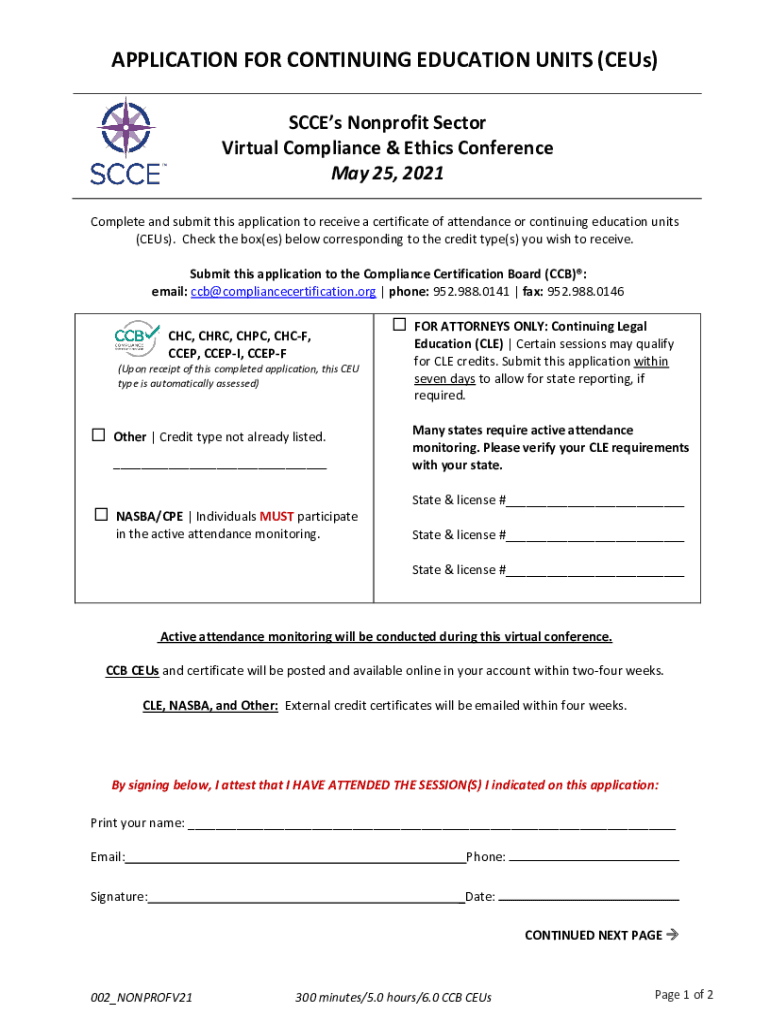 APPLICATION FOR CONTINUING EDUCATION UNITS (Zeus) SCC Es Nonprofit Sector Virtual Compliance & Ethics Conference May 25, 2021, Complete and submit this application to receive a certificate of attendance