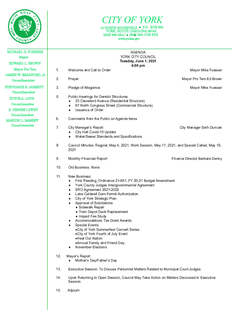 CITY OF YORK. O. BOX 500 10 NORTH ROOSEVELT YORK, SOUTH CAROLINA 29745 (803) 6841705 FAX (803) 6842341 www.yorksc.govMICHAEL D. GUESSER Mayor EDWARD L. BROWN Mayor Pro Tem JAMES W. BRADFORD, Jr. Council