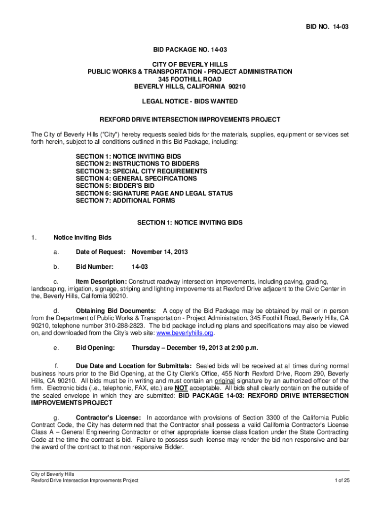 BID NO. 1403BID PACKAGE NO. 1403 CITY OF BEVERLY HILLS PUBLIC WORKS & TRANSPORTATION PROJECT ADMINISTRATION 345 FOOTHILL ROAD BEVERLY HILLS, CALIFORNIA 90210 LEGAL NOTICE BIDS WANTED REDFORD DRIVE