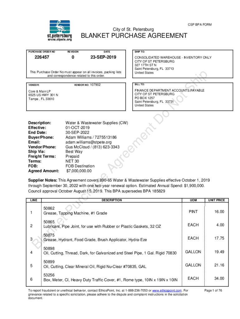 CSP BPA Ferocity of St. PetersburgBLANKET PURCHASE AGREEMENT2264570DATESHIP TO:23SEP2019This Purchase Order Now must appear on all invoices, packing lists and correspondence related to this order.