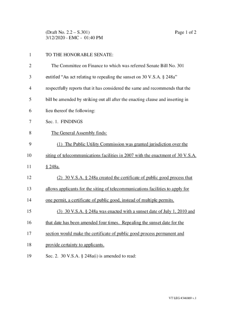 (Draft No. 2.2 S.301) 3/12/2020 EMC 01:40 PM1 2Page 1 of 2TO THE HONORABLE SENATE: The Committee on Finance to which was referred Senate Bill No. 3013entitled An act relating to repealing the sunset