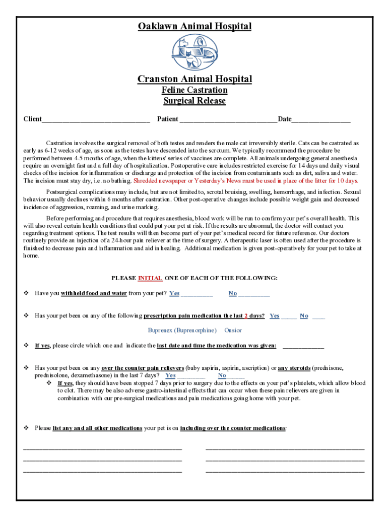 Oak lawn Animal HospitalCranston Animal Hospital Feline Castration Surgical Release Client___ Patient ___Date___ Castration involves the surgical removal of both testes and renders the male cat irreversibly