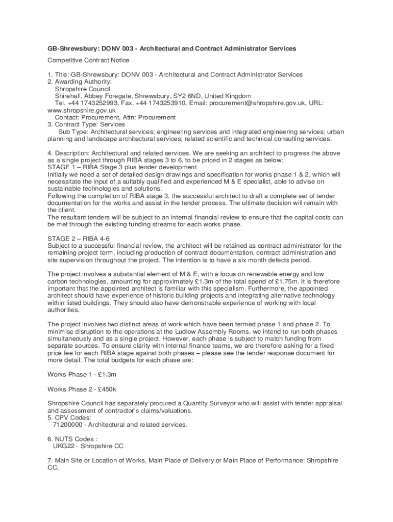 Shrewsbury: DONE 003 Architectural and Contract Administrator Services Competitive Contract Notice 1. Title: Shrewsbury: DONE 003 Architectural and Contract Administrator Services 2. Awarding Authority: