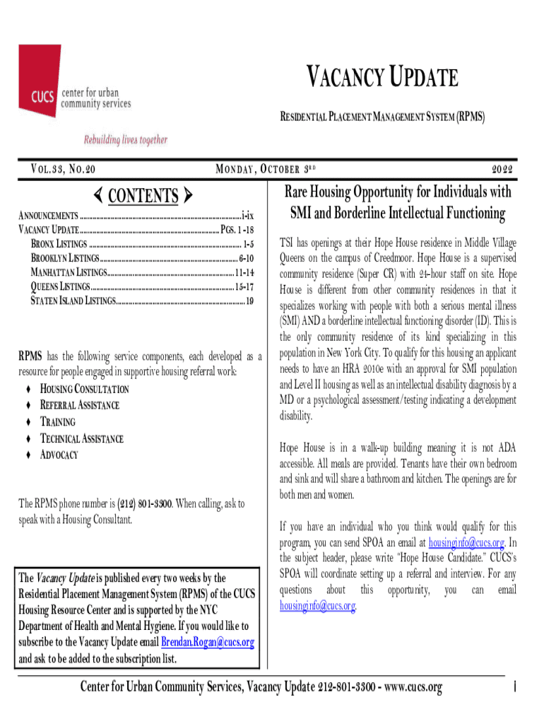 VACANCY UPDATE RESIDENTIAL PLACEMENT MANAGEMENT SYSTEM (RPM)VOL.33, NO.20MONDAY, OCTOBER 3RD CONTENTS ANNOUNCEMENTS .........................................................................................