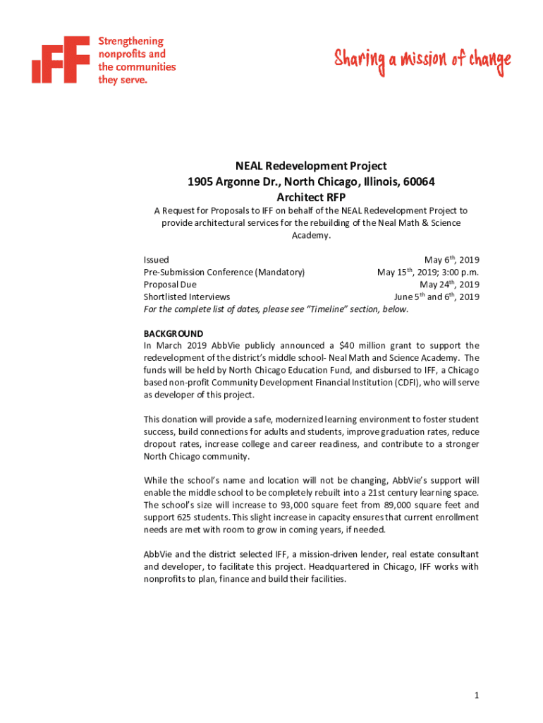 NEAL Redevelopment Project 1905 Argonne Dr., North Chicago, Illinois, 60064 Architect RFA Request for Proposals to IFF on behalf of the NEAL Redevelopment Project to provide architectural services