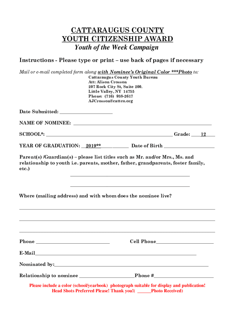 CATTARAUGUS COUNTY YOUTH CITIZENSHIP AWARD Youth of the Week Campaign Instructions Please type or print use back of pages if necessary Mail or email completed form along with Nominees Original Color