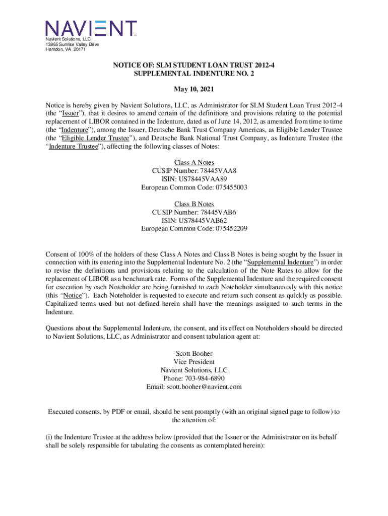 Patient Solutions, LLC 13865 Sunrise Valley Drive Herndon, VA 20171NOTICE OF: SUM STUDENT LOAN TRUST 20124 SUPPLEMENTAL INDENTURE NO. 2 May 10, 2021, Notice is hereby given by Patient Solutions, LLC,