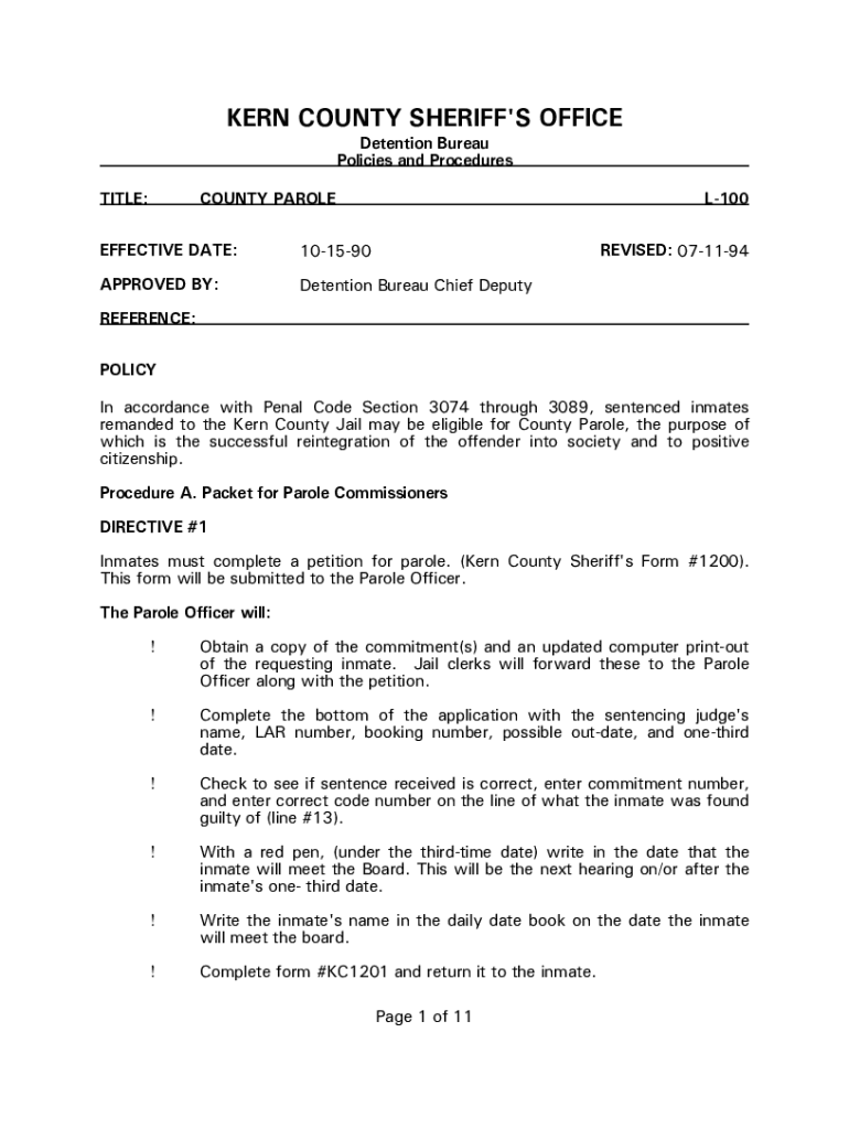 KERN COUNTY SHERIFF\'S OFFICE Detention Bureau Policies and ProceduresTITLE:COUNTY PAROLEL100EFFECTIVE DATE:101590REVISED: 071194APPROVED BY:Detention Bureau Chief DeputyREFERENCE: POLICY In accordance