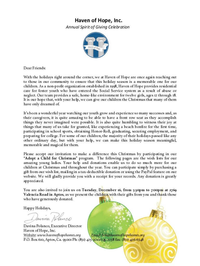 HavenofHope, Inc. AnnualSpiritofGivingCelebrationDear Friends: With the holidays right around the corner, we at Haven of Hope are once again reaching out to those in our community to ensure that this