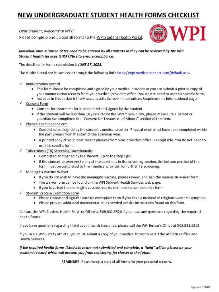 NEW UNDERGRADUATE STUDENT HEALTH FORMS CHECKLIST Dear Student, welcome to WEI! Please complete and upload all forms to the WEI Student Health Portal. Individual immunization dates need to be entered