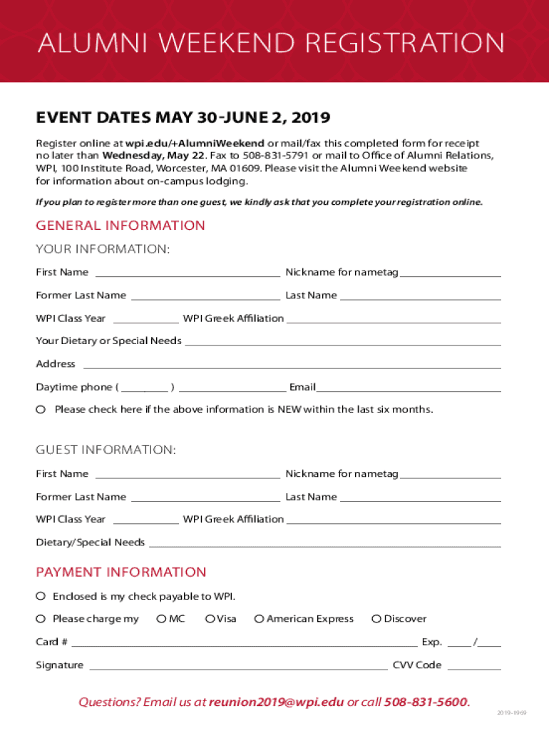 ALUMNI WEEKEND REGISTRATION EVENT DATES MAY 30JUNE 2, 2019 Register online at wpi.edu/+AlumniWeekend or mail/fax this completed form for receipt no later than Wednesday, May 22. Fax to 5088315791
