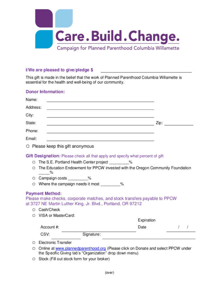 I/We are pleased to give/pledge $ This gift is made in the belief that the work of Planned Parenthood Columbia Willamette is essential for the health and wellbeing of our community. Donor Information: