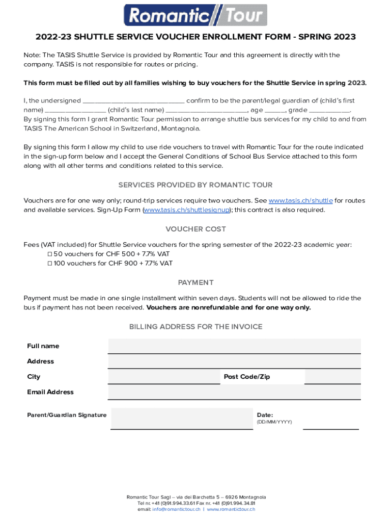 202223 SHUTTLE SERVICE VOUCHER ENROLLMENT FORM SPRING 2023 Note: The BASIS Shuttle Service is provided by Romantic Tour and this agreement is directly with the company. BASIS is not responsible for