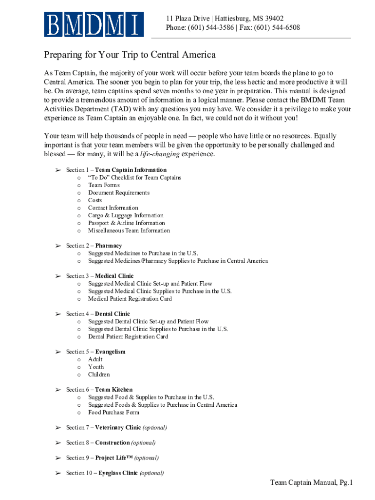 11 Plaza Drive | Hattiesburg, MS 39402 Phone: (601) 5443586 | Fax: (601) 5446508Preparing for Your Trip to Central America As Team Captain, the majority of your work will occur before your team boards