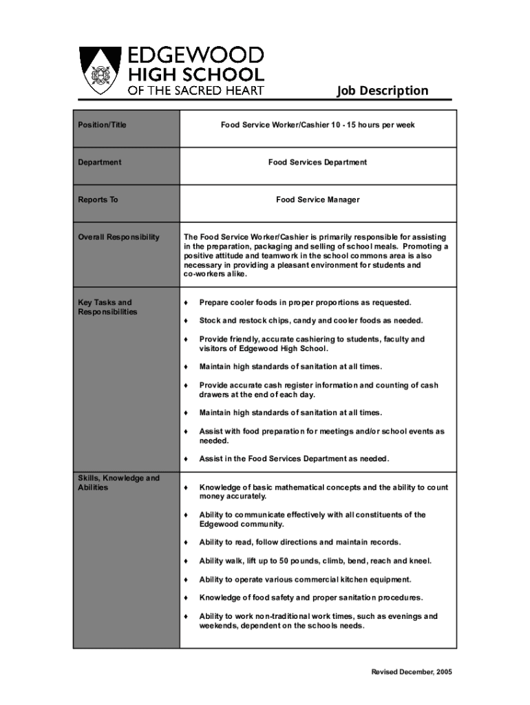 Position/Titled Service Worker/Cashier 10 15 hours per weekDepartmentFood Services DepartmentReports Food Service ManagerOverall Responsibility Food Service Worker/Cashier is primarily