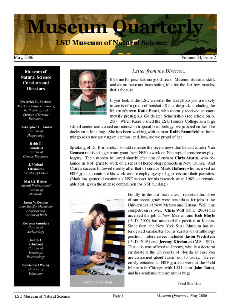 Museum Quarterly LSU Museum of Natural Science May 2006 Museum of Natural Science Curators and Directors Frederick H. Sheldon Director, George H. Lowery, Jr., Professor, and Curator of Genetic Resources