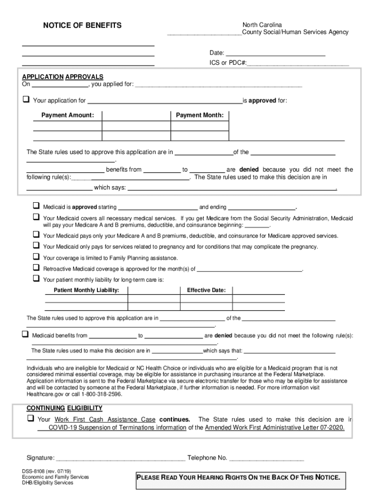 North Carolina ___County Social/Human Services AgencyNOTICE OF BENEFITSDate: ICS or PDC#:___ APPLICATION APPROVALS On, you applied for: ___Your application forms approved for:Payment Amount:Payment