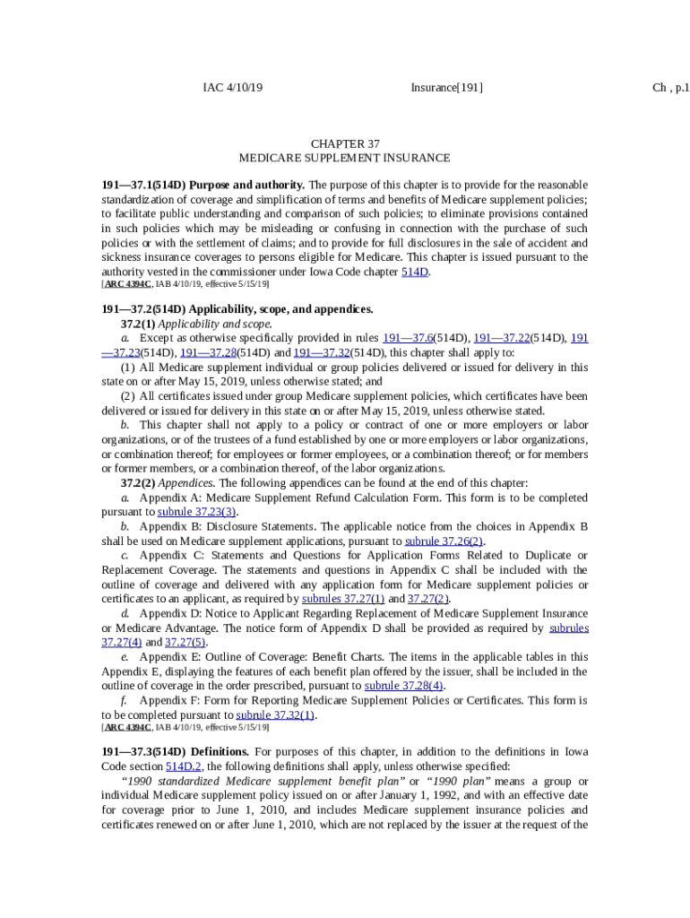 The 1 Title 19: Insurance Part 3: Accident, Health, and Medicare ... is a writable document that should be submitted to the relevant address to provide some information. It needs to be completed and signed, which is possible manually in hard copy, or with a certain solution like PDFfiller. It helps to complete any PDF or Word document directly in your browser, customize it depending on your purposes and put a legally-binding electronic signature. Right after completion, you can send the 1 Title 19: Insurance Part 3: Accident, Health, and Medicare ... to the appropriate recipient, or multiple individuals via email or fax. The editable template is printable as well thanks to PDFfiller feature and options proposed for printing out adjustment. In both digital and physical appearance, your form will have got neat and professional look. Also you can turn it into a template for later, so you don't need to create a new blank form from the beginning. You need just to edit the ready form.