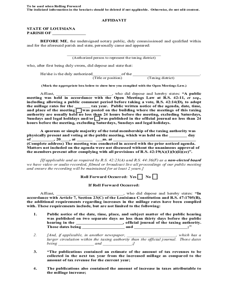 To be used when Rolling Forward The italicized information in the brackets should be deleted if not applicable. Otherwise, do not edit content. AFFIDAVIT STATE OF LOUISIANA PARISH OF ___ BEFORE ME,