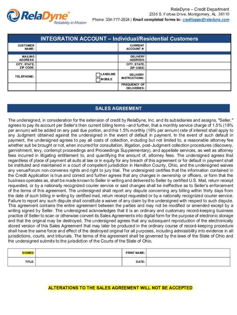 Reading Credit Department2335 S. Forbes Drive, Montgomery, AL 36110 Phone: 3347772924 | Email completed forms to: creditapps@reladyne.comINTEGRATION ACCOUNT Individual/Residential Customers CUSTOMER