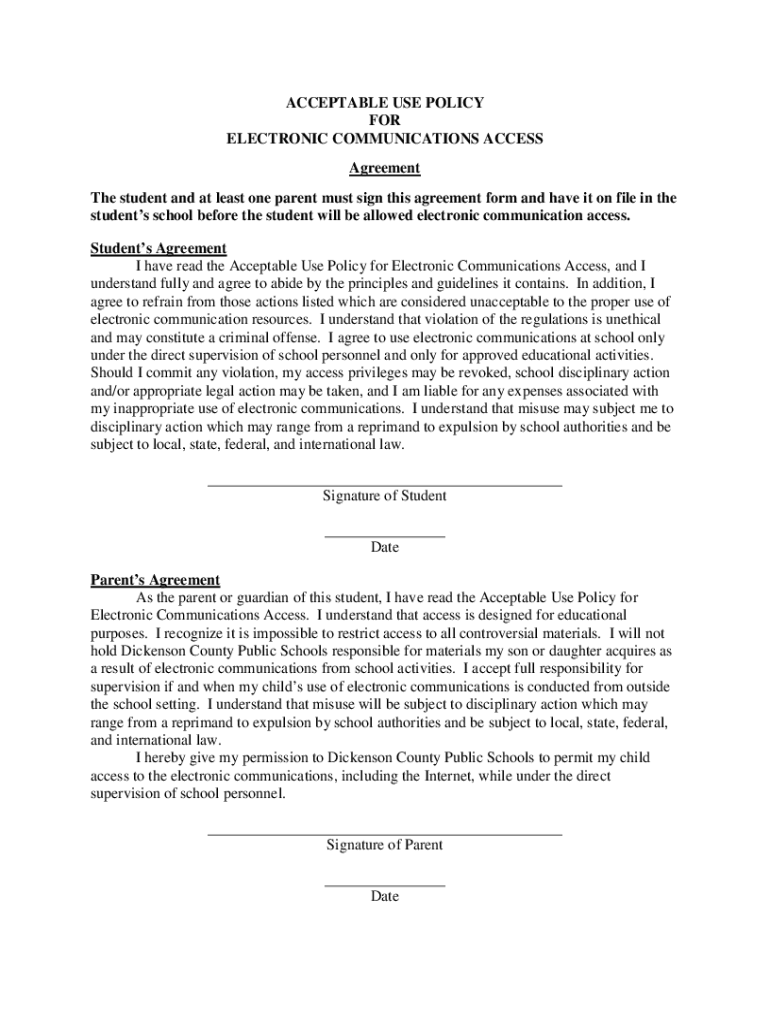 ACCEPTABLE USE POLICY FOR ELECTRONIC COMMUNICATIONS ACCESS Agreement The student and at least one parent must sign this agreement form and have it on file in the students school before the student