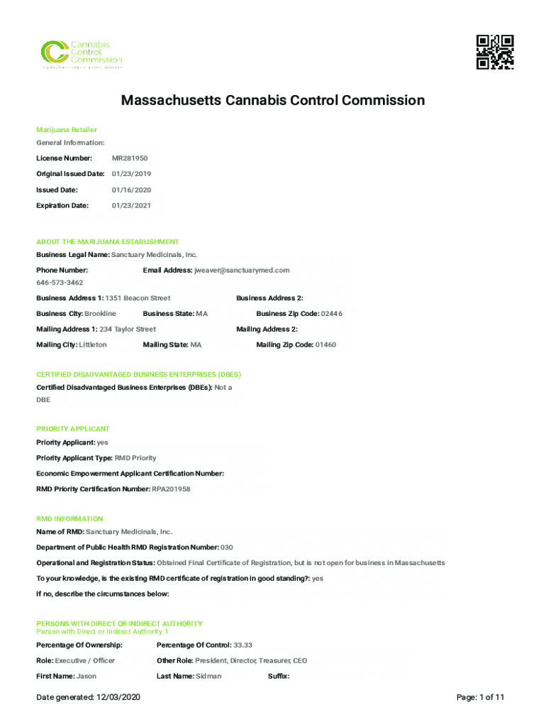 Massachusetts Cannabis Control Commission Marijuana Retailer General Information: License Number:MR281950Original Issued Date: 01/23/2019 Issued Date:01/16/2020Expiration Date:01/23/2021ABOUT THE
