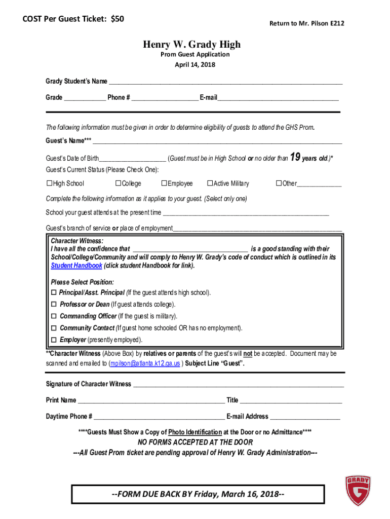 COST Per Guest Ticket: $50Return to Mr. Wilson E212Henry W. Grady High Prom Guest Application April 14, 2018, Grady Students Name ___ Grade ___ Phone # ___ Email___The following information must be