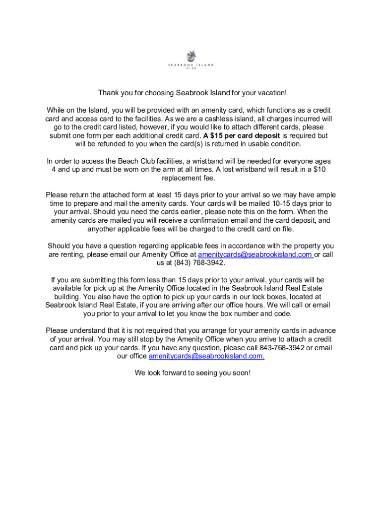 Thank you for choosing Seabrook Island for your vacation! While on the Island, you will be provided with an amenity card, which functions as a credit card and access card to the facilities. As we