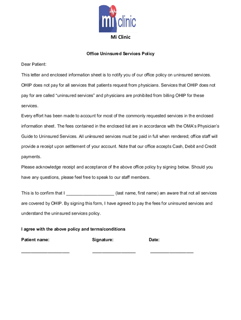 Mi Clinic Office Uninsured Services Policy Dear Patient: This letter and enclosed information sheet is to notify you of our office policy on uninsured services. SHIP does not pay for all services