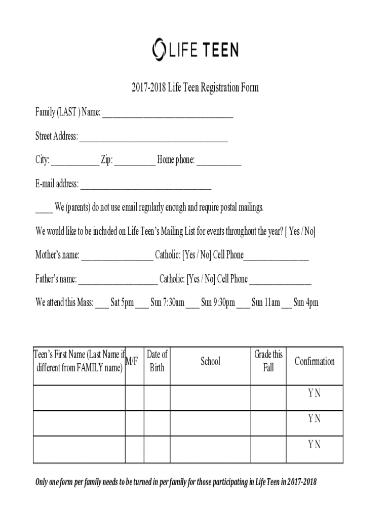 20172018 Life Teen Registration Form Family (LAST) Name: ___ Street Address: ___ City: ___ Zip: ___ Home phone: ___ Email address: ___ ___ We (parents) do not use email regularly enough and require