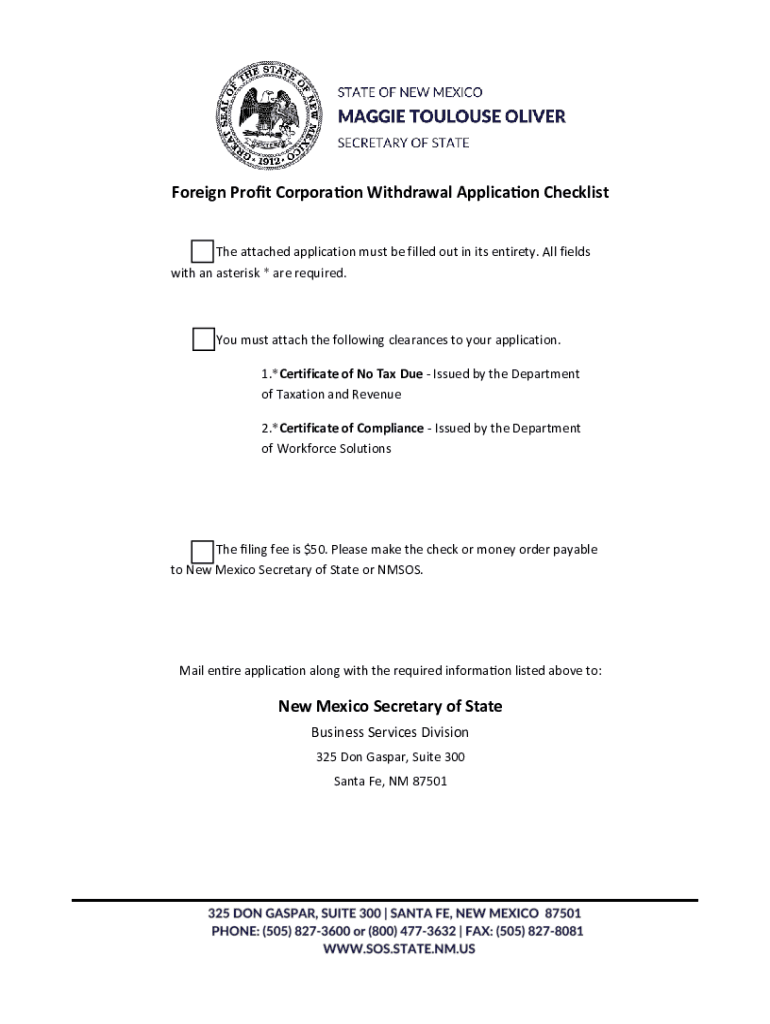 Foreign Profit Corporation Withdrawal Application Checklist The attached application must be filled out in its entirety. All fields with an asterisk * are required. You must attach the following clearances