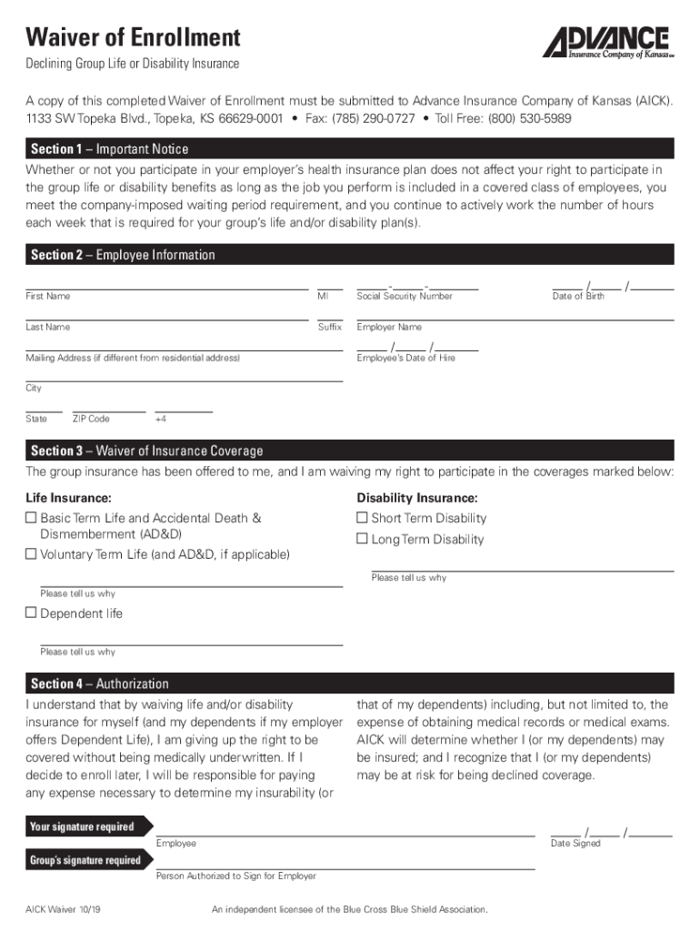 Waiver of Enrollment Declining Group Life or Disability Insurance A copy of this completed Waiver of Enrollment must be submitted to Advance Insurance Company of Kansas (PICK). 1133 SW Topeka Blvd.,
