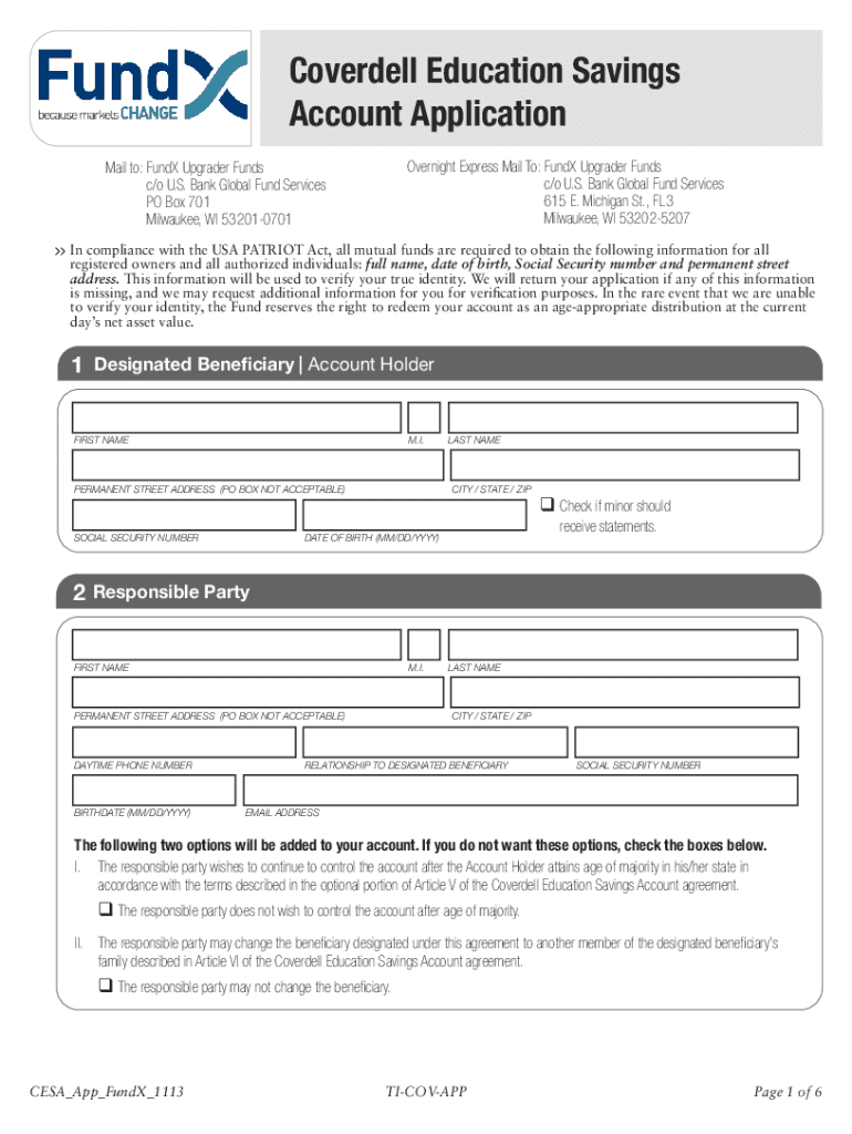 Cover dell Education Savings Account Application Mail to: Funds Upgraded Funds/o U.S. Bank Global Fund Services PO Box 701Milwaukee, WI 532010701Overnight Express Mail To: Funds Upgraded Funds/o U.S.