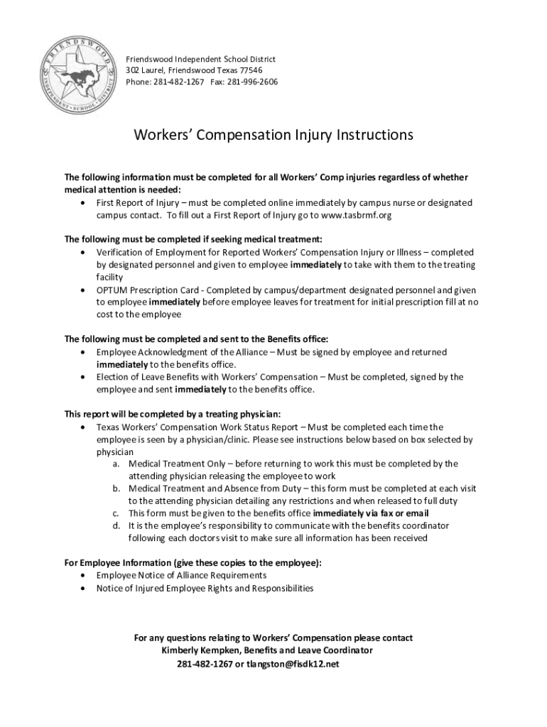 Friends wood Independent School District 302 Laurel, Friends wood Texas 77546 Phone: 2814821267 Fax: 2819962606Workers Compensation Injury Instructions The following information must be completed