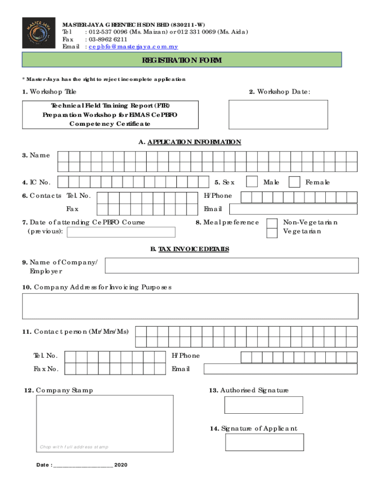 MASTER JAY GREENWICH SDN BHD (830211W) Tel : 012537 0096 (Ms. Maiman) or 012 331 0069 (Ms. Aida) Fax : 038962 6211 Email : cepbfo@masterjaya.com.myREGISTRATION FORM * Master Jay has the right to reject
