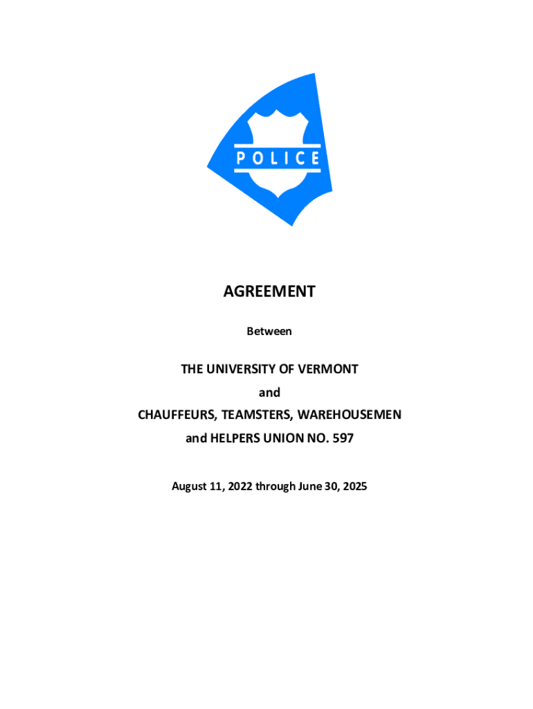 AGREEMENT Between UNIVERSITY OF VERMONT and CHAUFFEURS, TEAMSTERS, WAREHOUSEMEN and HELPERS UNION NO. 597 August 11, 2022, through June 30, 2025TABLE OF CONTENTSPAGEArticle 1RECOGNITION .......................................................................................................................................