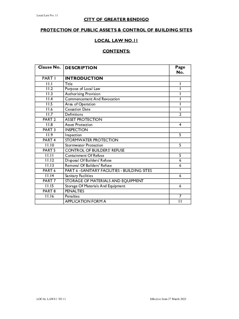Local Law No. 11CITY OF GREATER BENDIGO PROTECTION OF PUBLIC ASSETS & CONTROL OF BUILDING SITES LOCAL LAW NO.11 CONTENTS:Clause No. Page No.DESCRIPTIONPART 1INTRODUCTION11.1 11.2 11.3 11.4 11.5 11.6