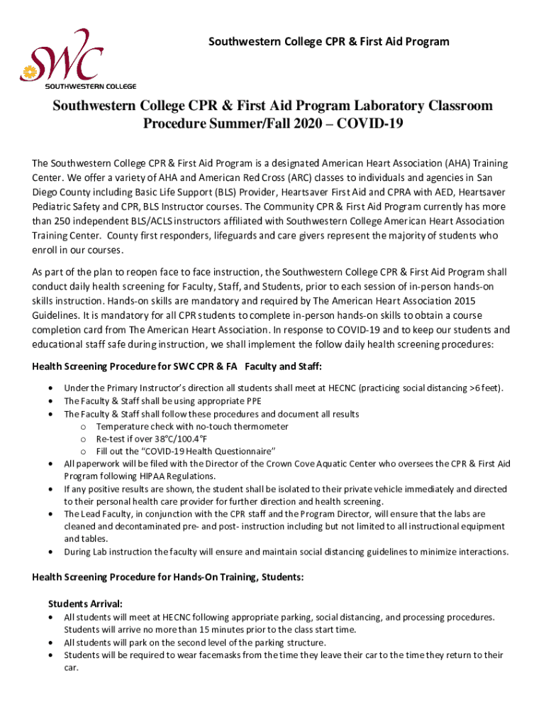 Southwestern College CPR & First Aid ProgramSouthwestern College CPR & First Aid Program Laboratory Classroom Procedure Summer/Fall 2020 COVID-19 The Southwestern College CPR & First Aid Program is