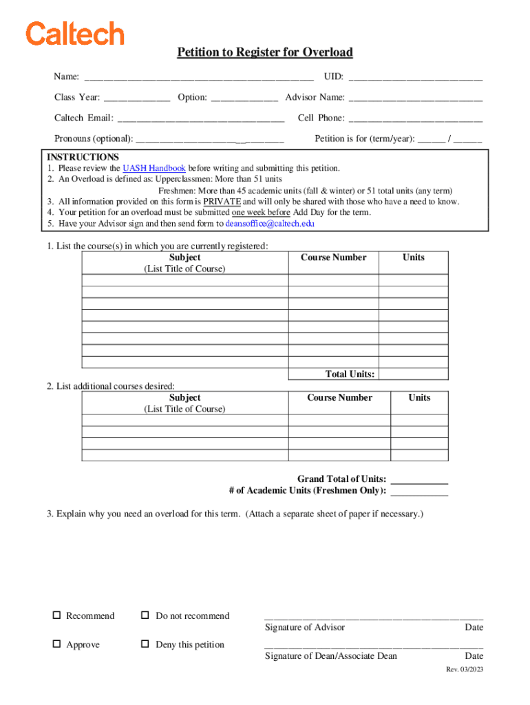 Petition to Register for Overload Name: ___UID: ___Class Year: ___ Option: ___ Advisor Name: ___ Caltech Email: ___Cell Phone: ___Pronouns (optional): ___Petition is for (term/year): ___ / ___INSTRUCTIONS1.