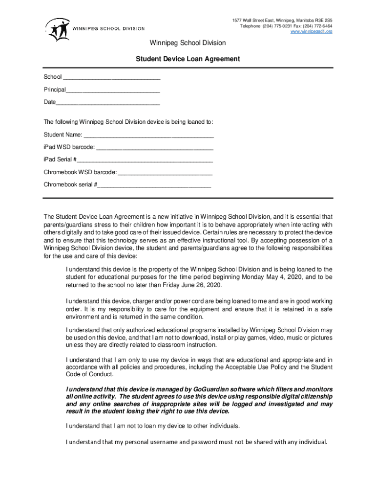 1577 Wall Street East, Winnipeg, Manitoba R3E 2S5 Telephone: (204) 7750231 Fax: (204) 7726464 www.winnipegsd1.orgWinnipeg School Division Student Device Loan Agreement School ___ Principal___ Date___