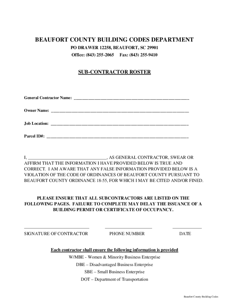 BEAUFORT COUNTY BUILDING CODES DEPARTMENT PO DRAWER 12258, BEAUFORT, SC 29901 Office: (843) 2552065Fax: (843) 2559410SUBCONTRACTOR ROSTERGeneral Contractor Name: ___ Owner Name: ___ Job Location: