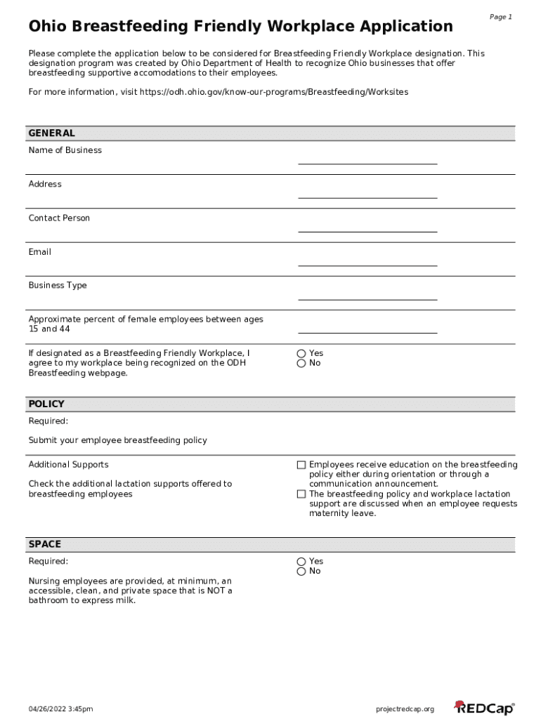 Ohio Breastfeeding Friendly Workplace Application Page 1Please complete the application below to be considered for Breastfeeding Friendly Workplace designation. This designation program was created