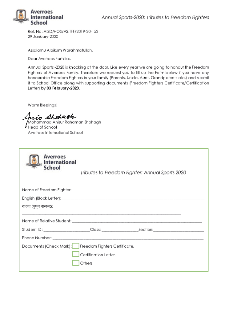 Annual Sports2020: Tributes to Freedom Fighters Ref. No: AID/HOS/AS:TFF/201920152 29 January2020 Assam Album Warahmatullah. Dear Averroes Families, Annual Sports 2020 is knocking at the door. Like