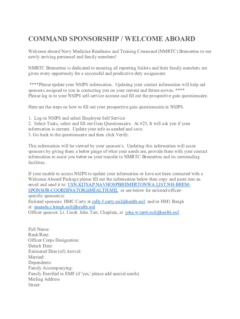 COMMAND SPONSORSHIP / WELCOME ABOARD Navy Medicine Readiness and Training Command (NM RTC) Bremerton to our newly arriving personnel and family members! NM RTC Bremerton is dedicated to ensuring all