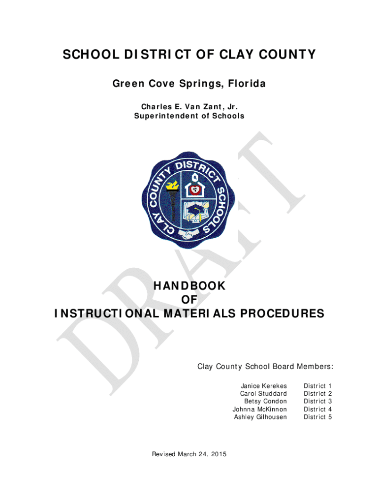 SCHOOL DISTRICT OF CLAY COUNTY Green Cove Springs, Florida Charles E. Van Want, Jr. Superintendent of SchoolsHANDBOOK OF INSTRUCTIONAL MATERIALS PROCEDURES Clay County School Board Members: Janice