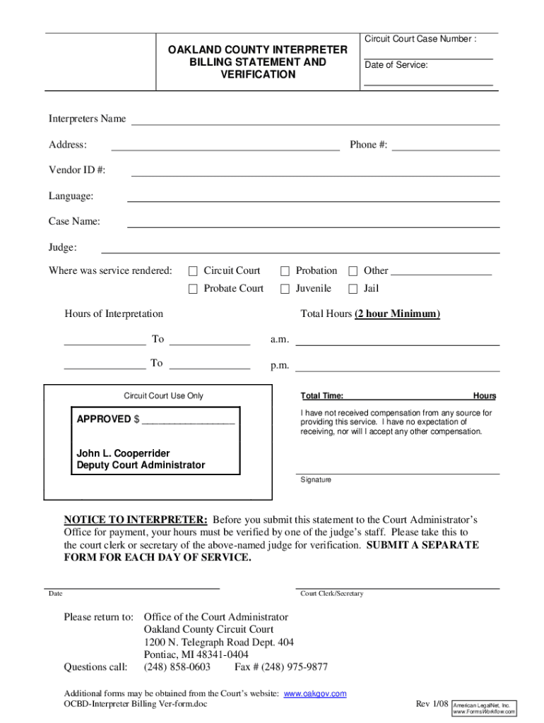 Circuit Court Case Number :OAKLAND COUNTY INTERPRETER BILLING STATEMENT AND VERIFICATIONDate of Service:Interpreters Name Address:Phone #:Vendor ID #: Language: Case Name: Judge: Where was service